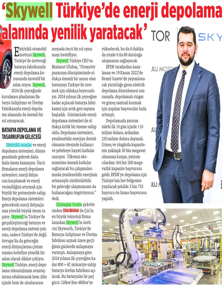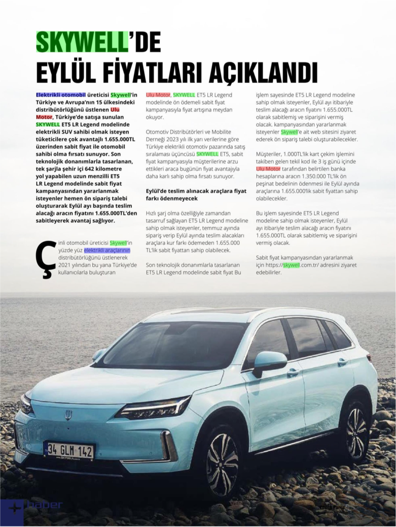 Yayın Adı: Otomobil Gazatesi (Online Dergi) Yayın Tarihi: 07.08.2023 İlginizi çekebilir;Skywell ET5 LR, 5 Yıldızın SahibiSkyworth ile Ulu Motor’dan Batarya Fabrikası YatırımıTek şarjla 642 kilometre menzile ulaşan SKYWELL ET5’ler Türkiye’de kullanıcılarla buluşmaya başladı